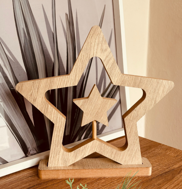 Estrella con base en madera MDF enchapada en Melamina Medidas: 28 x 28 x 2 cm