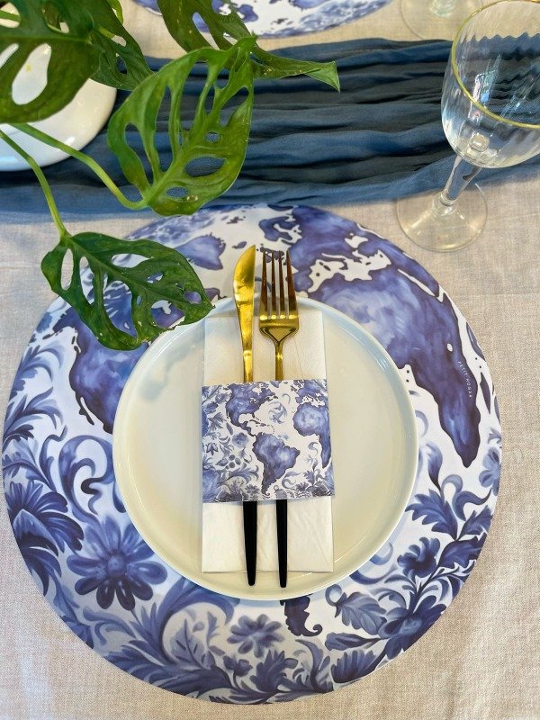 El set contiene 24 Platos de Sitio de papel descartables + 24 Porta servilletas
